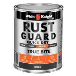 Rust Guard Quick Dry True Bite Primer paint by White Knight is a high quality, water-based, anti-corrosive, universal metal primer. This quick drying formulation allows you to prime and paint in the same day. Perfect for use on new galvanised iron or Zincalume, as well as other ferrous metals.
